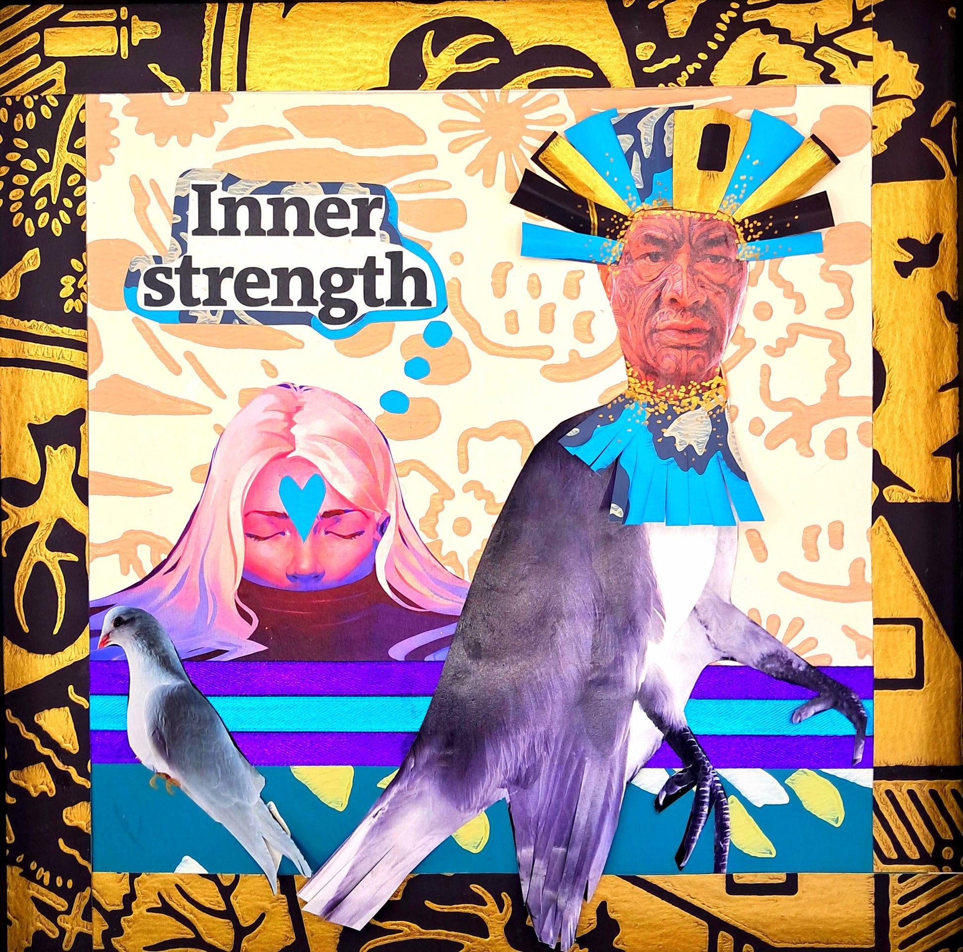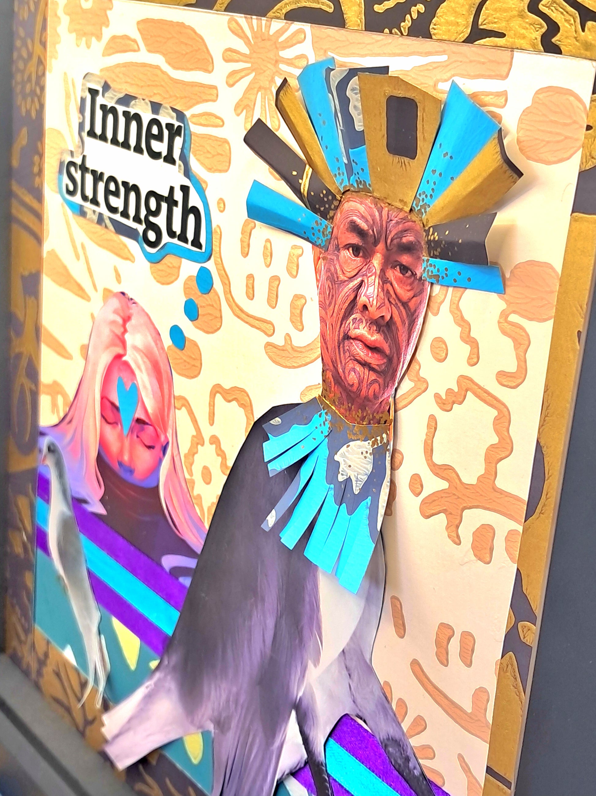 Only one available. Created with images upcycled from magazines and blue and purple ribbon. 21 different pieces of paper were used and the bird's headress is three dimentional.